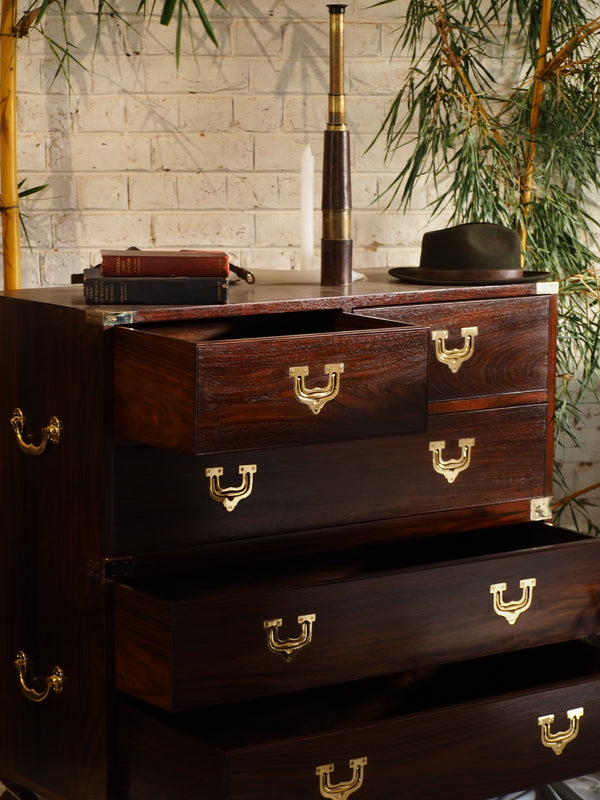Campaign furniture which is designed to be ‘folded up’ and carried long distances has been a feature of travelling armies over many centuries. With the expansion of the European explorers through the eighteenth and nineteenth centuries, the finest European furniture makers competed to design and produce elegant, ingenious and fashionable knock-down furniture for colonial officers and civilians traveling to these distant provinces.